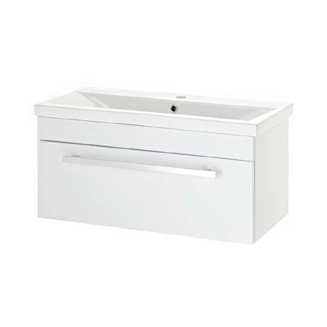 A minimalist 800mm wall mounted vanity unit with quality stylish mid edge’ ceramic basin top, make the most of your bathroom with our practical and attractive modern white gloss furniture options.