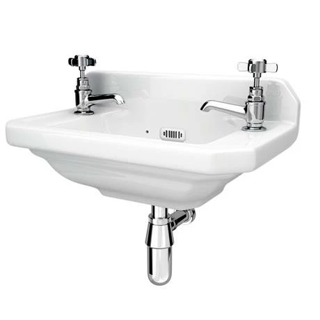 A high-quality traditional 2 tap hole wall hung cloakroom basin with overflow, ideal for creating a period look in your bathroom or Cloakroom. Manufactured using high-grade vitreous china ensuring a quality finish and long lasting durability. Bring a touch of elegance and style into your home.