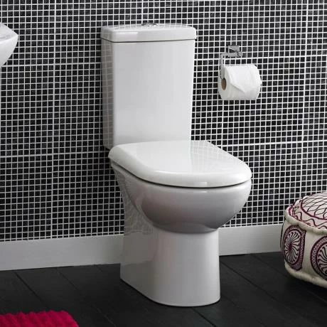 white ceramic material, the short projection close coupled toilet features a