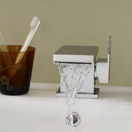 This minimalist waterfall mixer has a low lying profile with a side action lever tap head, this controls on/off and temperature control.