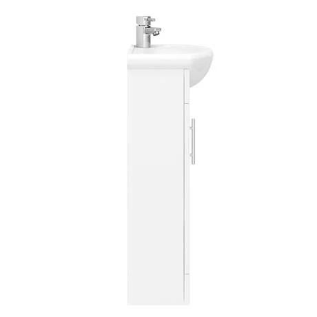 The Sienna Vanity Unit in High Gloss White is a slim storage solution for a smaller space such as a cloakroom or compact bathroom. The slender 420mm wide basin vanity unit comes in a high gloss white finish with gleaming chrome handles and the ceramic basin is manufactured to the highest standards for durability and reliability. Beneath, the cupboard is a useful place to store cloakroom essentials for an uncluttered look. It comes fully constructed to save you time and effort installing. Team the gloss white vanity unit with the Sienna BTW Toilet Unit for a coordinated look.